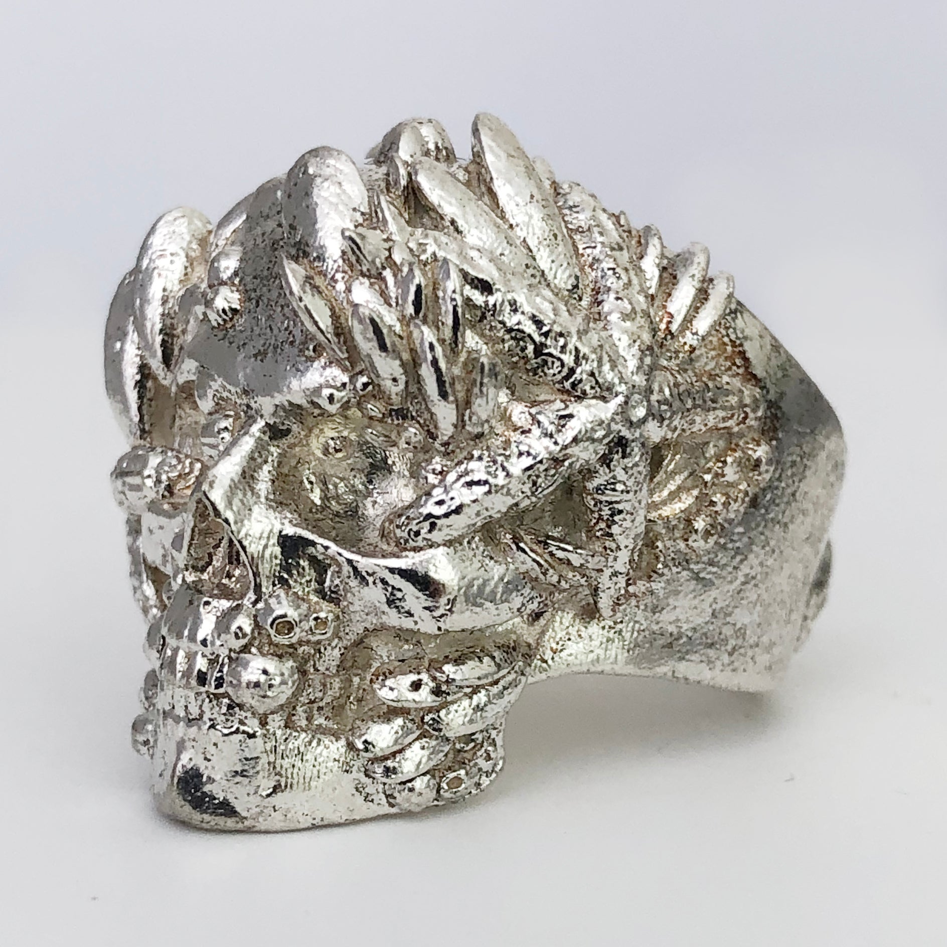 The perfect ring for all those who long for the sea. This classic skull has been overtaken by nature in the depths of the ocean, now overgrown with barnacles, mussels, limpets, and starfish. Was it an ill-fated pirate seduced by the siren's song, dragged to the depths below, doomed to drown for eternity? The siren song of the sea calls you too, you hear it no matter where you are. Or perhaps you are the mermaid who sings that song... Embrace your mystical connection to the sea with this expertly detailed ring.