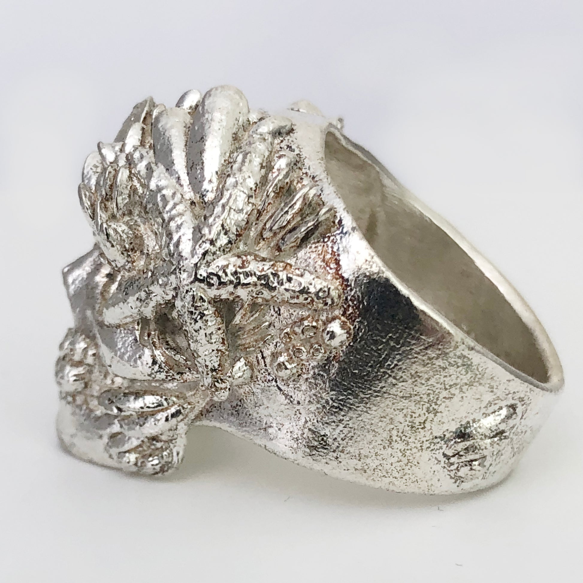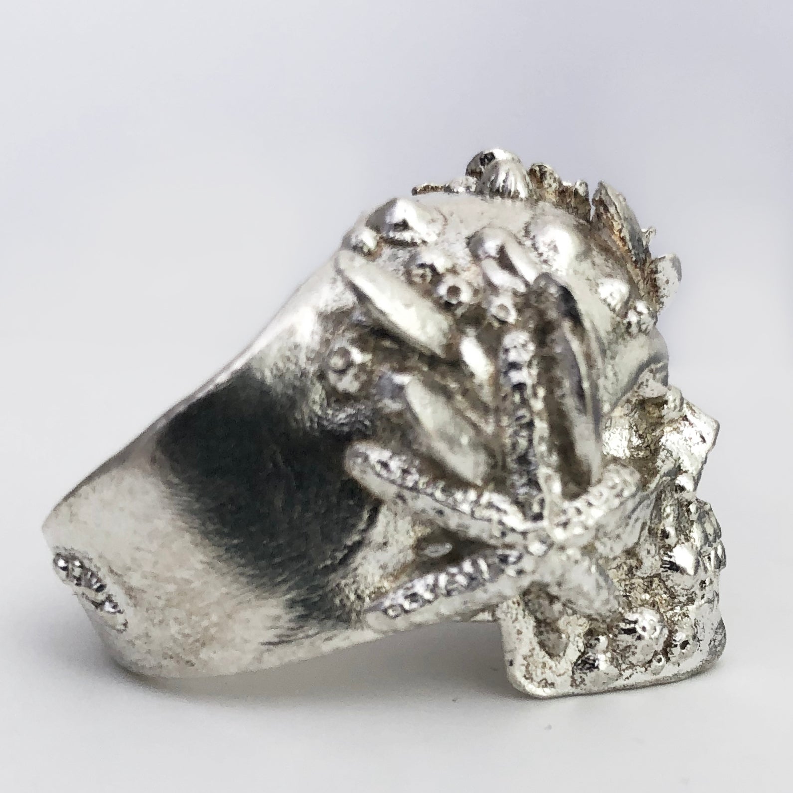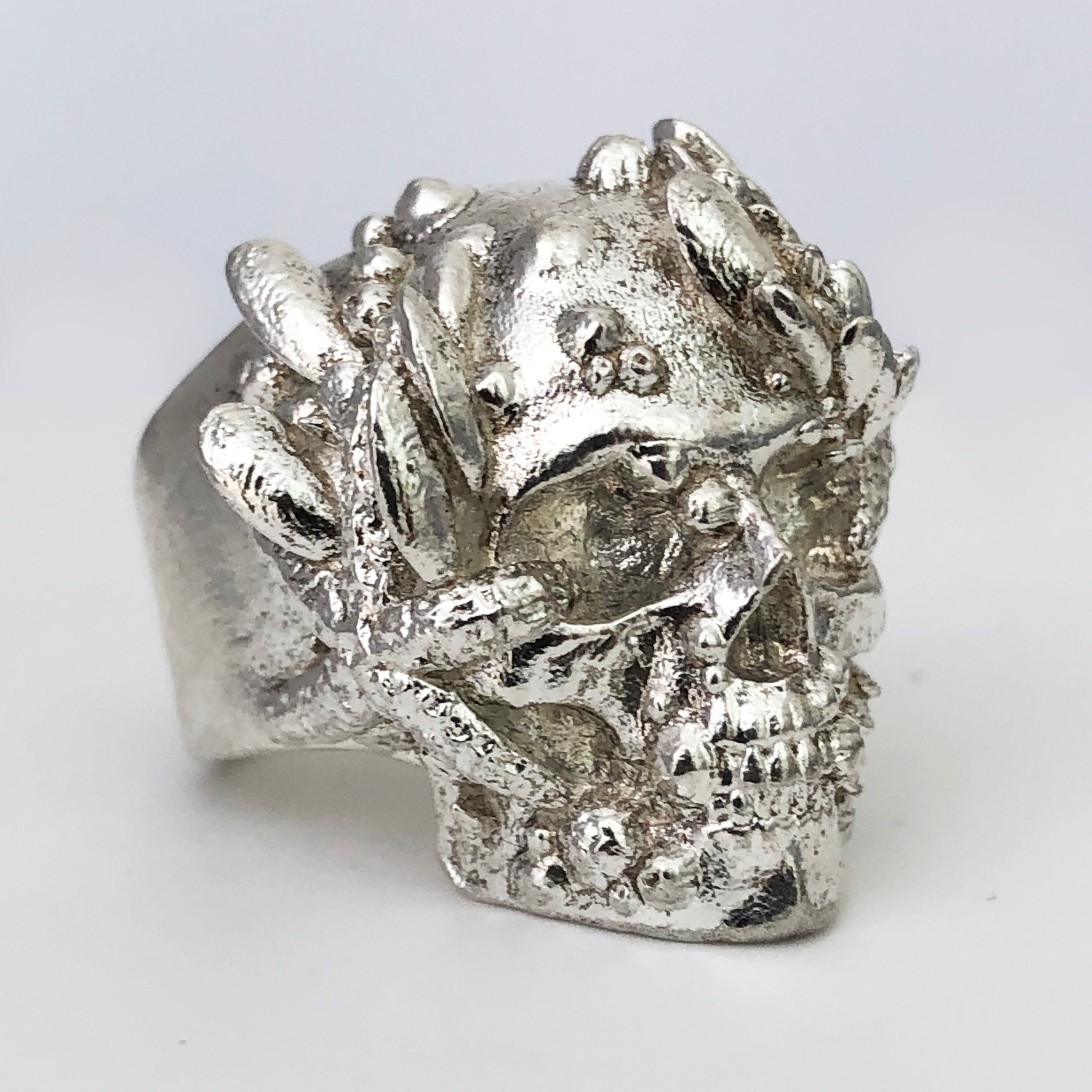 This is not your everyday run of the mill skull ring. Note the intense realism and attention to detail based upon our study of actual human skulls, and observing the sealife in our sleepy little beach town. We are classically trained artists and what sets this apart are the countless hours and many years of careful studying of human anatomy in the manner of the old masters that goes into our skull pieces.